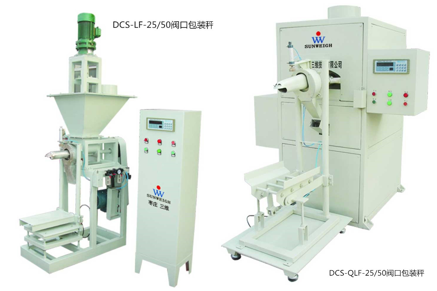 DCS-LF-25/50閥口包裝秤和DCS-QLF-25/50閥口包裝秤是棗莊三維生產的主打產品。閥口式定量包裝秤是集自動計量、灌裝、封包于一體,不需縫口機縫包的包裝機;并采用閥口式包裝工藝,減少了粉塵外溢;高速處理控制儀表及數字變頻技術,確保了極高的計量準確度。