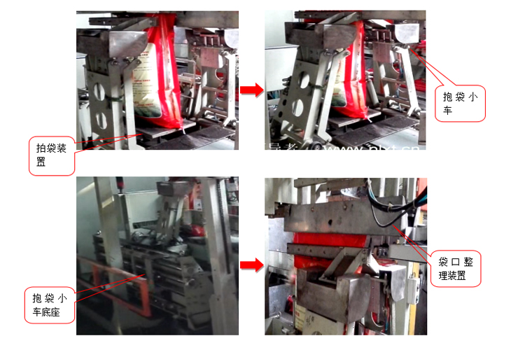 上袋裝置中開袋吸盤從包裝袋口上下兩個(gè)方向同時(shí)將包裝袋口吸開,上袋機(jī)械手伸入袋口內(nèi),將袋的上下兩面同時(shí)夾住,彎曲機(jī)械臂將包裝袋套到定量包裝秤下料口,過程結(jié)束。