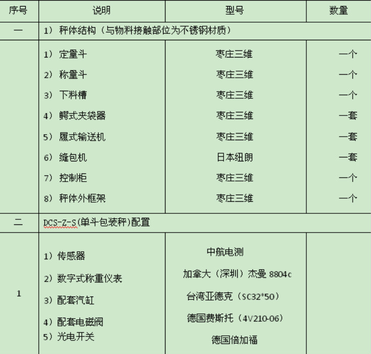 一。DCS- Z-S定量包裝秤(單斗包裝秤)設備配置詳單: